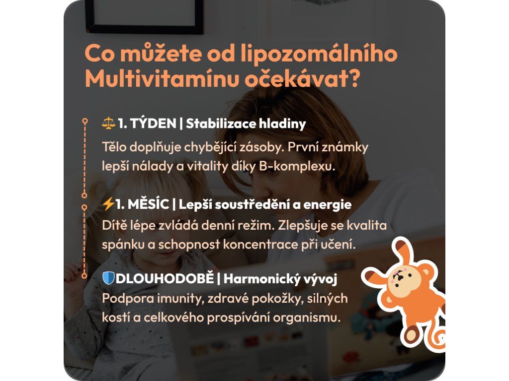 Multivitamín je sice přizpůsoben především dětem, ale díky moderní lipozomální formě mají jednotlivé účinné látky velmi dobrou vstřebatelnost. A právě o to jde! Nezáleží totiž na tom, jak vysoké dávky vitamínů užíváte, důležité je množství, které tělo dokáže využít.