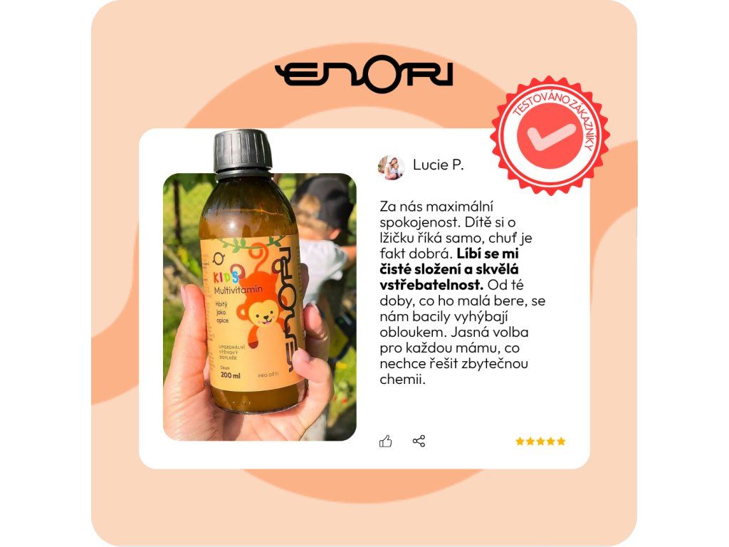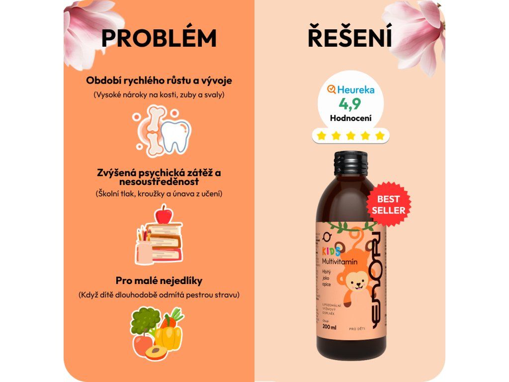 Enori Multivitamin je ideální pojistkou pro „nejeďáky“ a děti v období rychlého růstu, kdy efektivně podporuje vývoj kostí, zubů i svalů. Pomáhá lépe zvládat psychickou zátěž ve škole i únavu po sportu, čímž zajišťuje dětem stabilní energii a vitalitu po celý rok.